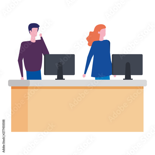 adult, couple, friends, friendly, team, company, girl, female, woman, formal, work, man, male, boy, working, desk, computer, online, workplace, cheerful, beautiful, attractive, character, young, casual attire, smiling, cute, men at work, fashion, professional, illustration, vector, office, cartoon, happy, clothes, business, employee, elegant, smart, positive, job, occupation, student, successful, executive