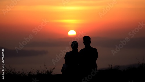 silhouette, couple, man, woman, sitting, watching, sunrise, sunset, sun, sky, orange, red, mist, fog, mountain, landscape, romance, together, peaceful, scenic