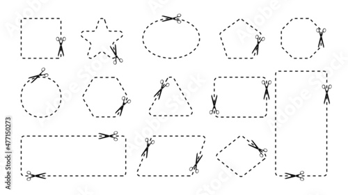 Coupon cut line. Scissors with dash line border of coupon. Rectangle, circle and square shapes. Blank template of voucher with cutout. Paper discount icon with frame on white background. Vector