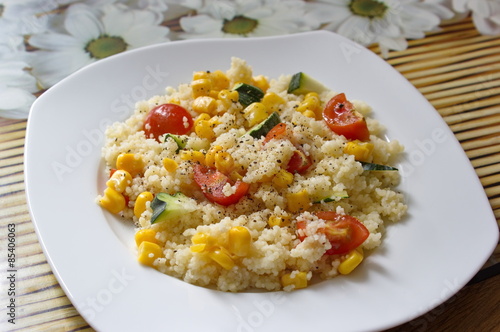 couscous served with corns, zucchini and tomatoes