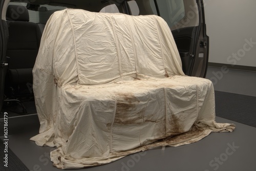 car, seat, covered, dirty, stain, dirt, fabric, beige, protection, transportation, vehicle, interior, mud, dirtied, contamination, clean, maintenance, repair, damage, cleaning, wrinkled, crumpled, storage, covering, safety, material, spot, detail, preservation, automotive, organic, substance, cover, textile