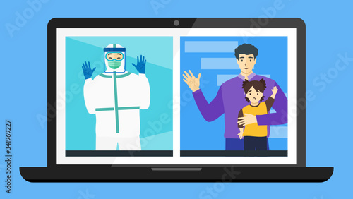 computer, homesick, miss, greet, service, chat, group, shield, novel, clothing, equipment, personal, measure, gear, protective, hand, wave, virus, pharmacy, corona, surgical, scientist, glove, zoom, talk, care, health, father, mother, woman, goggles, clinic, hospital, essential, team, work, home, children, mask, face, staff, personnel, medic, assistant, nurse, doctor, pandemic