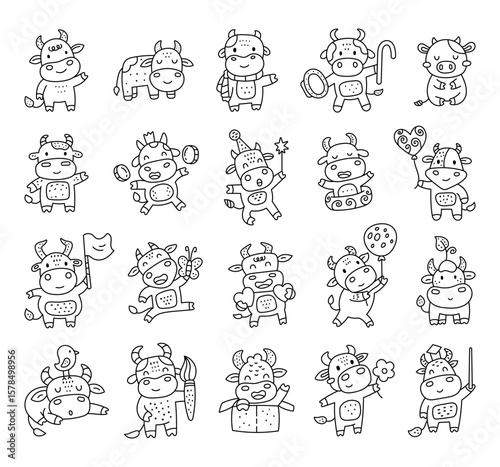 Cow cartoon character set in outline line art charming animals wearing accessories, sitting, relaxing, sleeping, greeting, standing, smiling poses for holiday and everyday designs projects