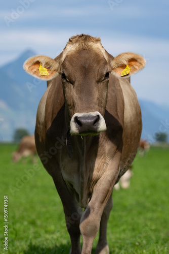 Cow grazing in a green pasture. Herd of cattle in grassland. Alpine meadows with grazing cow. Farmland with cow livestock. Grassy fields filled with cow. Grazing bovine. Cattle ranch.