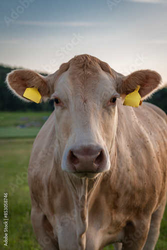 Cow on pasture land with sunset colors near Kremze town in south Bohemia