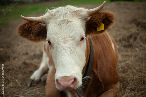 Cow on the farm. Animal with horns.