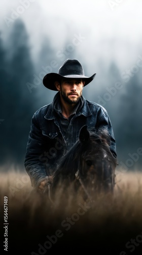 Cowboy riding horse through misty landscape in forest during early morning hours