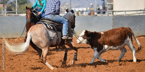 Cowboy roping a little cow during the cutting horse event