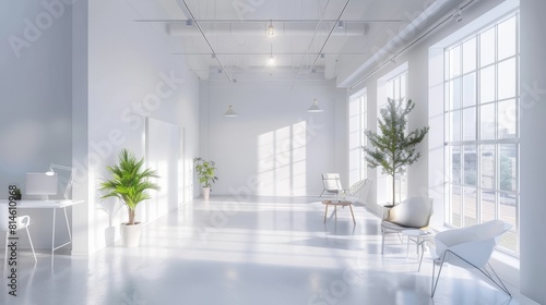 office, interior, wall, workspace, business, design, three-dimensional, copy space, empty, workplace, modern, blank, partition, entrance, desk, work, room, loft, armchair, furniture, city, view, skyscraper, shelf, table, computer, monitor, desktop, chair, document, panoramic, team, teamwork, render, rendering, illustration, technology, concrete, floor, style, marketing