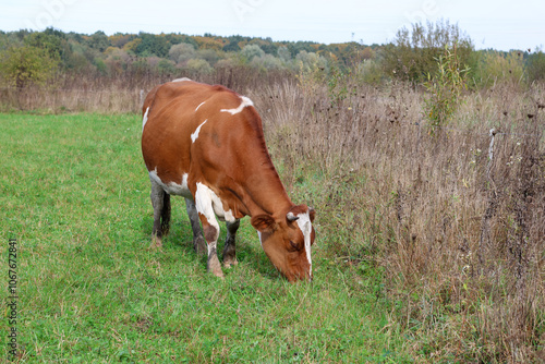 Cows graze in the pasture. Agriculture. Cattle breeding.