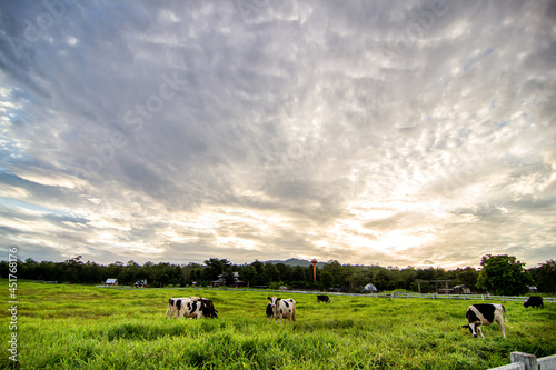 Cows grazing on a green summer meadow. Livestock