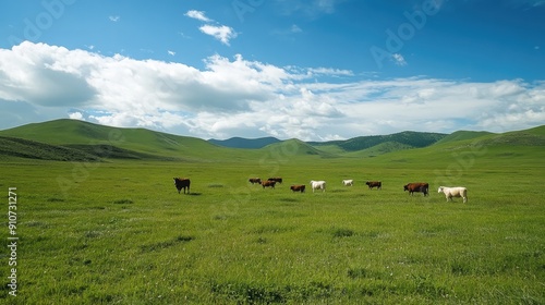 Cows Grazing on Lush Green Meadow with Rolling Hills and Blue Sky
