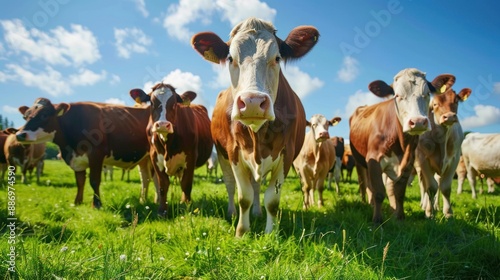 cow, cattle, herd, field, grass, green, meadow, pasture, farm, rural, countryside, agriculture, farm animal, nature, animal, mammal, domesticated, brown, white, sky, cloud, sunny, day, outdoors, landscape, horizon, farmland, dairy, bovine, hoof, eye, nose, horn, ear, tail, grazing, grazing land, farmhouse, barn, hay, wildlife, photo, summer, calf, milk, beef, head, portrait, bull