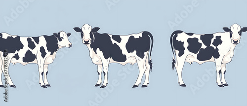 Cows in different poses, vector flat icon illustration set on a light blue background. A simple, minimalistic, cartoon hand drawn style