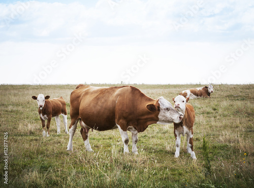 cow, calf, cattle, farm animal, pasture, animal, herbage, copy space, cuddle, herd, summer, brown, outdoors, horizontal, nobody, agriculture, day, sweden, scandinavia, horizon