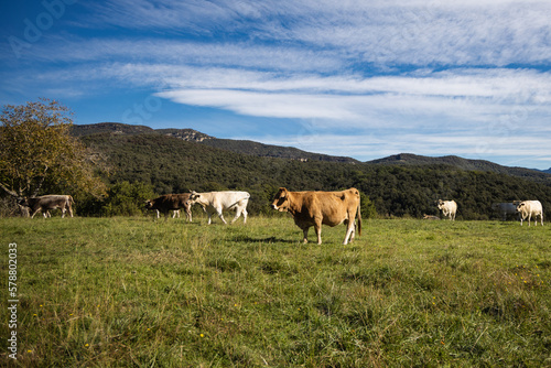 Cows resting in the meadow in mountains, Spain