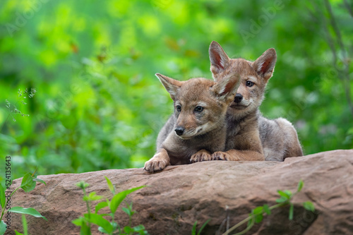 Coyote Pup (Canis latrans) Looks Over Top of Sibling on Rock Summer