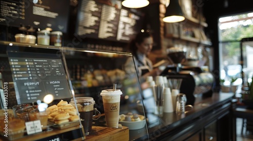 Cozy and Inviting Cafe Interior with Pastries Coffee and Drink Menu Displayed in a Contemporary Warm Lighting Setting