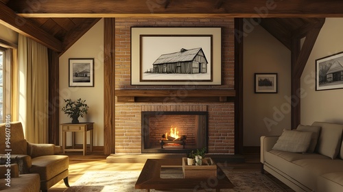 Cozy and inviting farmhouse style living room featuring exposed wooden beams a brick fireplace and a warm ambient lighting scheme Showcasing a pencil sketch of an old barn in a rustic