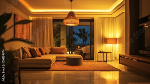 hotel, room, interior, luxury, cosy, tropical, view, lighting, furniture, sofa, armchair, table, lamp, curtain, window, decor, design, comfort, relaxation, hospitality, accommodation, resort, vacation, oasis, hideaway, indoor, evening, ambience, atmosphere, calmness, elegance, warmth, sophistication, inviting, opulent, plush, serene, exclusive, paradise, retreat, escape