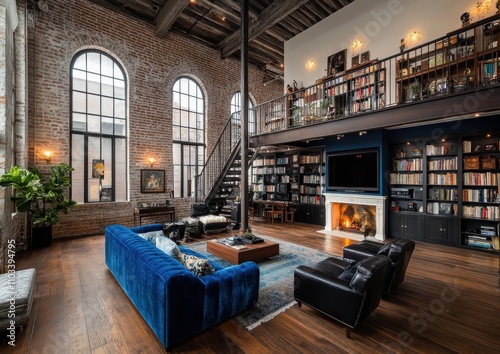 Cozy and Stylish Living Room with Exposed Brick Walls, Elegant Furniture, and Abundant Natural Light, Perfect for Modern Home Decor Inspiration