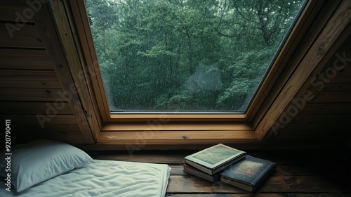 attic, cosy, window, rain, nature, book, relaxing, afternoon, wooden, soft, bed, calmness, landscape, reading, indoor, peaceful, home, shelter, craft, quiet, overhead, light, green, forest, comfort, retreat, leisure, escapism, lifestyle, minimalist, rustic, atmosphere, solitude, daydream, rainy, weather, horizontal, space, study, nook, beam, book, stack, sleep, decor, interior, design, personal, warmth, environment