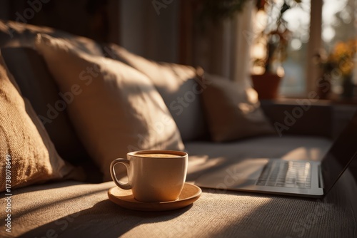 Cozy autumn remote work scene in a sunlit Scandinavian living room, mindful productivity, sustainable materials, laptop and coffee, golden-hour rim light