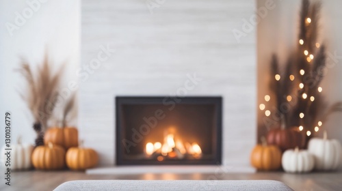 cozy autumn scene featuring warmly lit living room corner pumpkin-themed decorations and crackling fireplace in comforting