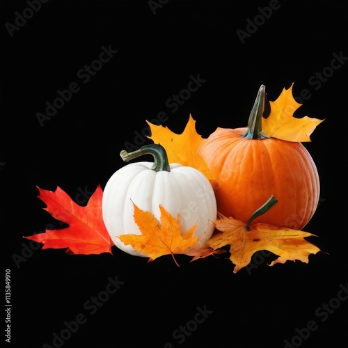 pumpkin, fall, autumn, leaf, orange, white, red, yellow, pumpkin, leaf, still life, colours, size, scattered, background, black, stand out, warm, cosy, feeling