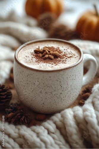 Cozy Autumn Vibes: A Warm Cup of Cocoa with Pumpkin Spice and Knitted Blanket.