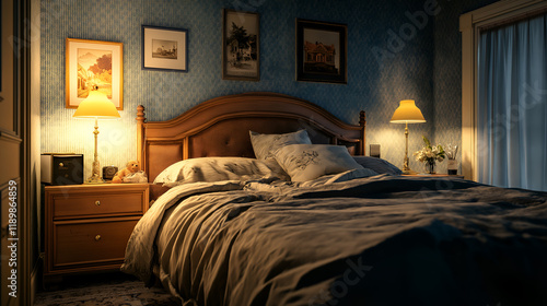 Cozy bedroom featuring a queen sized bed with neutral bedding, bedside tables, and a lamp, perfect for a mock up. Resident and Apartment Mockup and concept