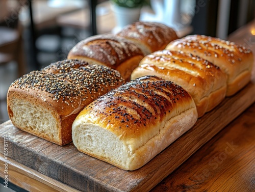 Cozy Bread Selection on Rustic Wooden Board, Warm Tones, Assorted Varieties, Inviting Atmosphere, Perfect for Gatherings