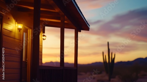 Cozy cabin at sunset in the desert with a cactus silhouette and colorful sky backdrop