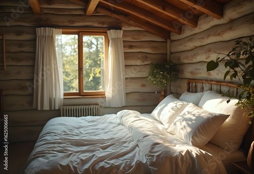 cabin, bedchamber, rustic, cosy, wood, log cabin, bed, window, sunlight, tranquil, serene, retreat, haven, interior, comfortable, peaceful, nature, plant, natural light, warm, inviting, escape, relaxation, quiet, simple, charming, home, design, architecture, country, forest, get-away, vacation, holiday, accommodation, lodging, timber, beam, curtain, radiator, morning, afternoon, light, shadow, texture