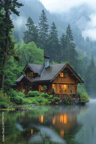 Cozy cabin by a serene river, lush green meadow, tall pine trees, tranquil mountain scenery