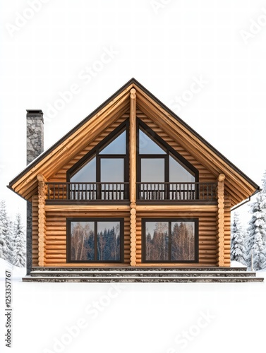 Cozy Cabin in Winter: A serene winter landscape frames a classic log cabin, its warm wooden facade a welcome sight against the snowy surroundings, with large windows letting in the crisp winter light.