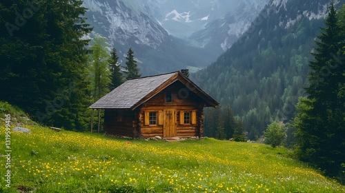 Cozy cabin retreat nestled in a lush mountain meadow, perfect for an escape to tranquility and nature.