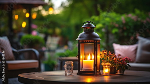 cozy cafe terrace outside ,blurred lantern candle light, soft sofa flowers and trees in garden ,cozy house atmosfear on evening