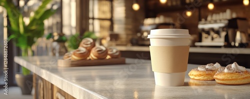 Cozy cafe interior with coffee cup and pastries on counter in warm sunlight
