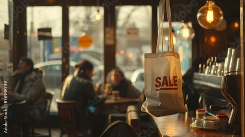 Cozy cafe with 'Sale' tote bag, warm lights, and people sitting by window