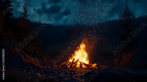 campfire, night, sky, nature, outdoors, wilderness, camping, adventure, landscape, scenery, environment, dusk, darkness, fire, flames, spark, tree, mountain, forest, silhouette, rustic, cosy, warm, glowing, atmospheric, tranquil, serene, peaceful, remote, escape, relaxation, leisure, solitude, journey, lifestyle, wanderlust, balefire, twilight, starry, moonlight, pine, rocky, terrain, trekking, hiking, snowy, chilly