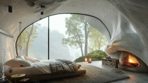 window, interior, fireplace, room, rock, house, stone, landscape, home, curtain, ancient, sea, architecture, old, cave, nature, bedchamber, sky, view, jordan, wood, water, wall, travel