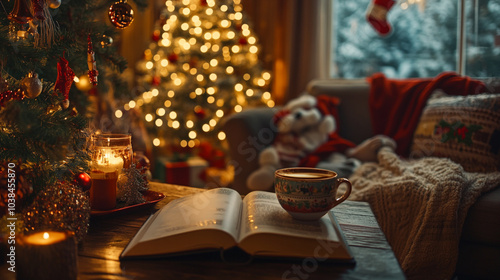 Cozy Christmas Day with a warm drink and holiday decorations in a festive living room setting