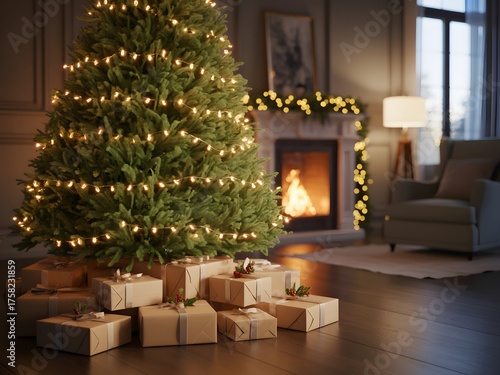 Cozy christmas eve scene with a beautifully decorated evergreen tree adorned with warm fairy lights and presents beneath