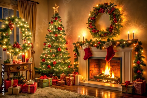 Cozy Christmas Eve Scene with Decorated Tree Fireplace Wreath and Gifts Creating a Warm and Festive Holiday Atmosphere