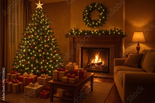 Cozy Christmas Living Room: A beautifully decorated Christmas tree illuminates a warm living room, surrounded by festive decorations and the inviting glow of a fireplace.