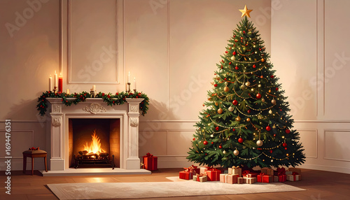 Cozy Christmas Living Room with Decorated Tree and Fireplace