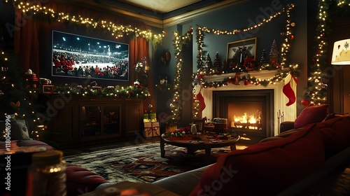Cozy Christmas Living Room with Festive Decorations and Fireplace
