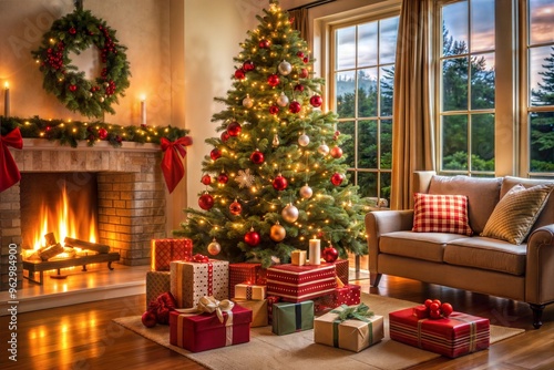 cosy, christmas, living room, tree, fireplace, gift, window, sundown, festive, decorative, light, chaplet, couch, present, holiday, interior, fire, candle, evening, winter, warm, seating, red, green, gold, brick, glasses, wrapped, ribbon, bow, pine, ornament, garland, glow, comfortable, homely, celebration, dusk