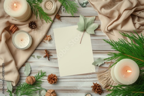 Cozy Christmas mockup top view with kraft paper on wooden table, burning candle, fir branches, warm beige knitted sweater, pine cones, cinnamon, and cloves. Christmas aesthetics. Flat lay.